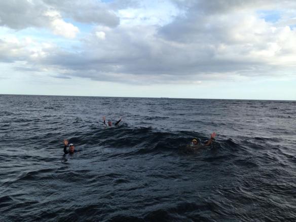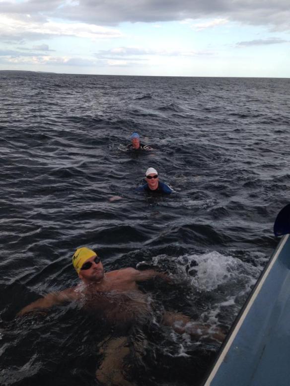 2hr 4.75km (5) and Ian joins us again for our second and final feed. This time I ask him to drop a rope so I can hold on while I feed (yes I cheated !). This time I take on board the full 250ml and a few jelly babies (another Carol Cashell trick). Breda and Harry also have a good feed and while we feed we hear shouting from the hills above. Claire, Peter, Nana and John (my family) are up there to give us boost and it works. We know the finish is in sight and the mind now seems very positive. We all are enjoying every stroke, breath and wave.
