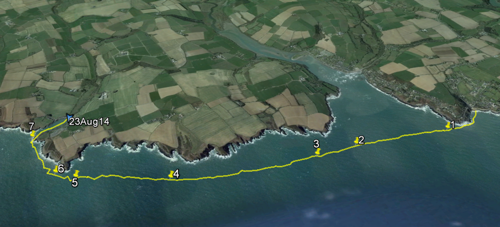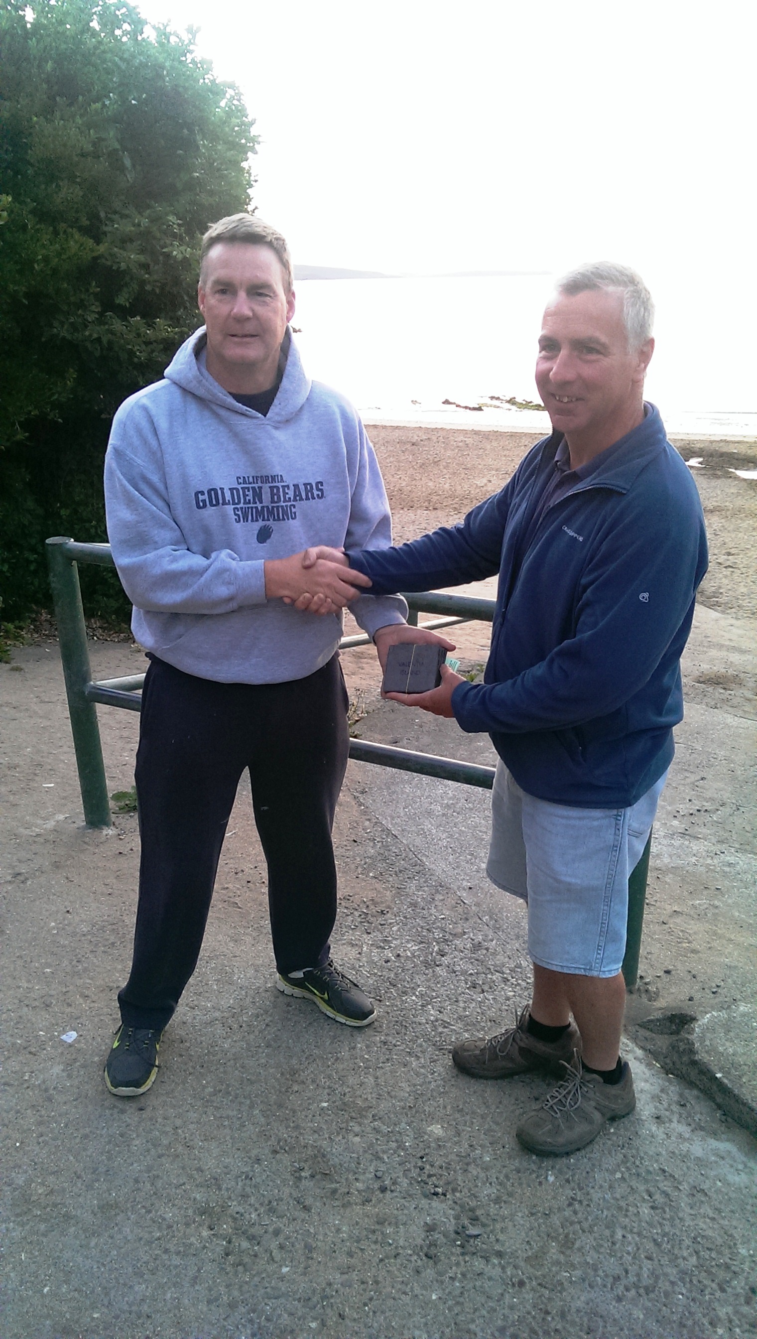2hr 9min 5km (6). I shout over to Harry and Breda to have one final look back towards Myrtleville before we turn for Roberts Cove. It is some sight. It seems to be so far away. We turn and follow the shoreline passing fishermen (Sean Foley asked them if this was “Irlande” in a French accent) (7) on the rocks before seeing Roberts cove and listen to the cheering of our respective families encouraging us to the finish.