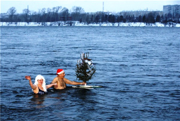 This is how it’s done – The Cryophil Winter Swimming Club in Siberia. We need a flag for next year – definitely. And one of those green garlandy things.
