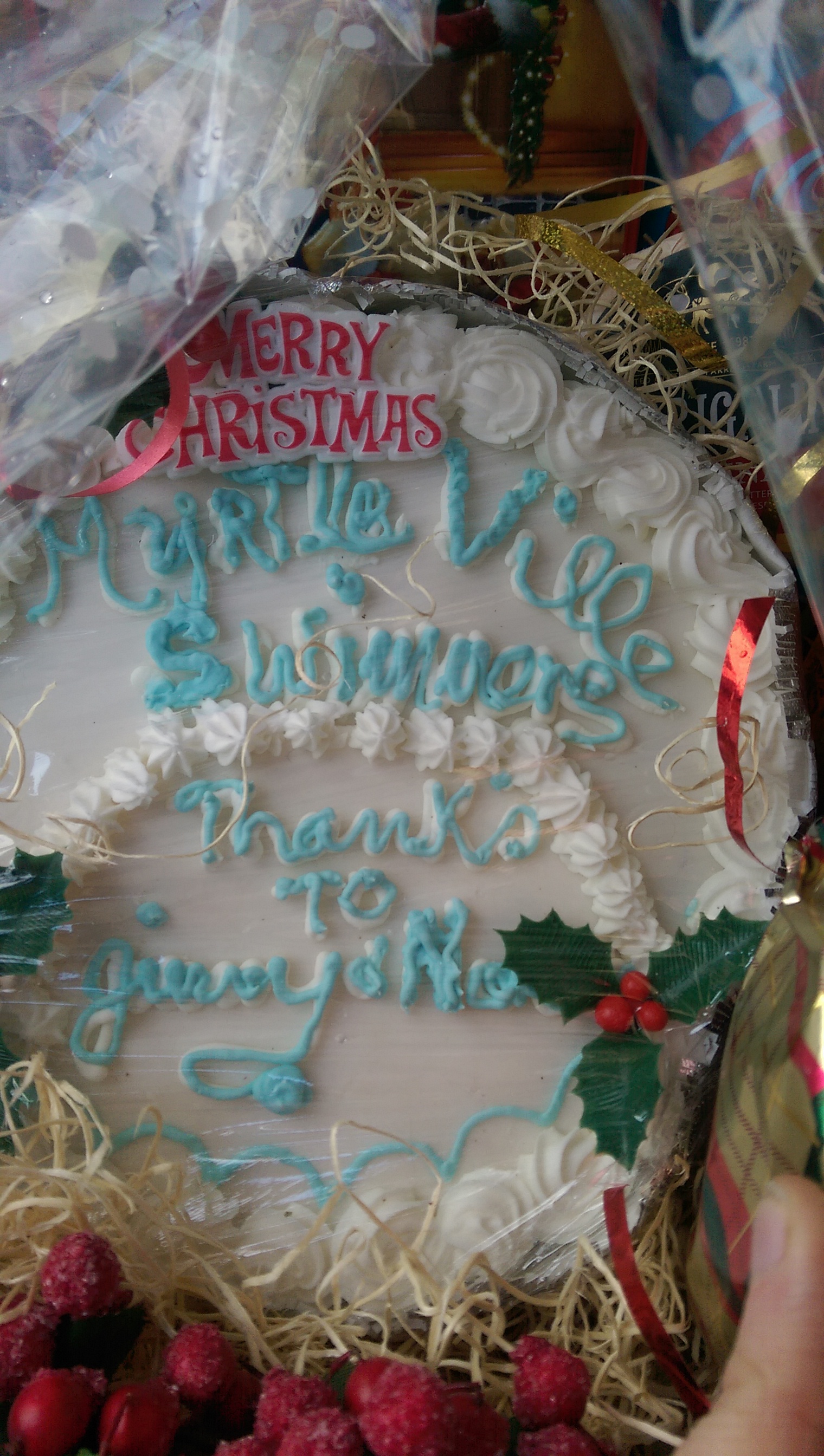Jimmy Long and Tom Bermingham gave great short speeches on what swimming in Myrtleville means to them and timely reminders about always swimming safely, no matter how experienced you are. Jimmy was presented with a “thank-you” Christmas hamper for his generosity, including this cake for himself and his wife, Noreen.