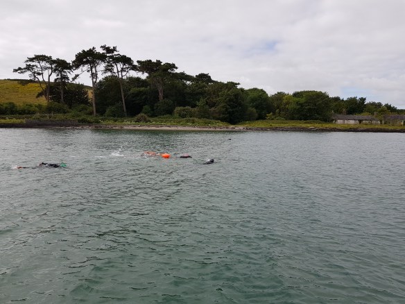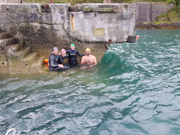 What started as a chat about swimming home from Spike Island after a 5k run saw four Myrtleville Swimmers jump on a rib at 0830 on Saturday 29th July and head for the West Camber at Fort Camden. Gary Frost (togs), Ger Venner, Ian Heffernan and Maeve O’Connor (wetsuits) were about to embark on the First Known attempt to swim from Camden to Spike and back – a measured distance of 7k.