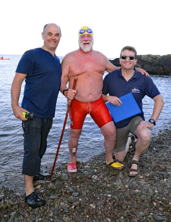 The tide running out the back channel helped a little at this stage, but that also created wind over tide conditions which meant the swimmers were dropping off waves or going through them. The waves & falling tide also made sighting and course made good very challenging. The closer to Camden they got, however, it became more about the tide and less about the waves. The four swimmers crossed the mouth of the Owenabue in two batches between traffic, and fought the outgoing current to land on the pier at Camden, 2 hours 50 minutes and 8k covered distance after setting off.