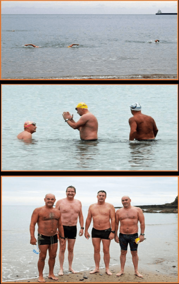 I was plodding along out by the corner at Bunnyconnellan when I saw three swimmers approaching. At speed. I mean – speed. It was the intrepid trio of Bernie, Jim and Trev. I turned around to head back to the beach – with them about 200 metres behind me. I was 500m out. As you can see from the first picture below (that’s me there in the distance on the left) they passed me – at speed, like – and were a good 200m ahead of me hitting the beach.