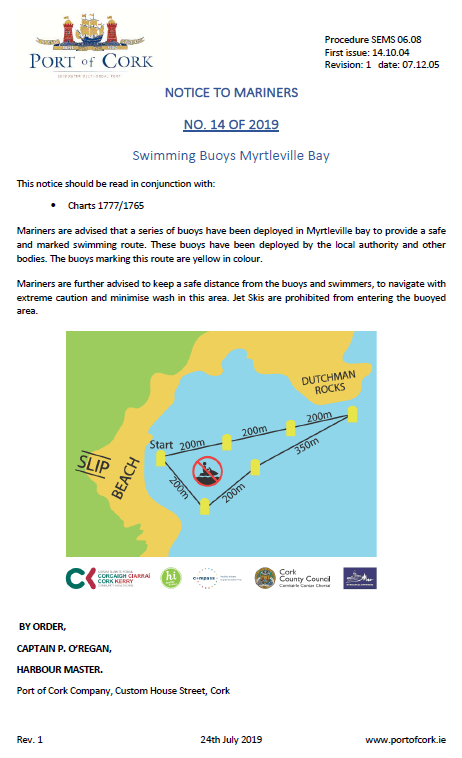 Some swimmers incorrectly believe that no boats can access Myrtleville Bay or the area in or around the yellow marker buoys. It is correct that Jet Skis are prohibited from the buoyed area. Boats are most definitely NOT prohibited.