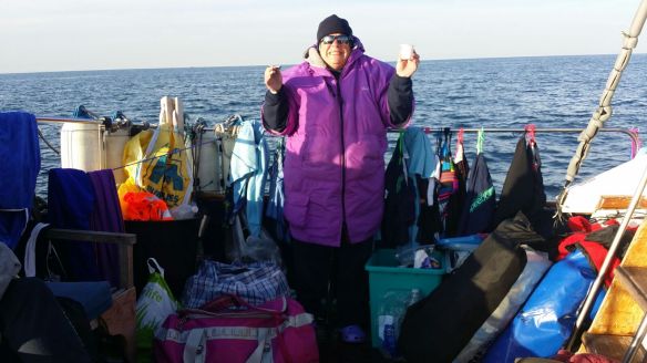 I then saw Rob and Carol changing; I thought into their togs. I thought they must be getting ready to swim in with me to France. Fergal Sommerville told me he had watched for this sign on his swim. Alas they were only putting on warmer clothes. On and on and the crew told me they were very happy and Andy thought one more hour. I could visualise the end even though my arms and shoulders were sore and tired. Carol had changed to 20minutes feeds and then told me two laps of Sandycove and we are there. I took exception to this so she agreed on a measurement of Myrtleville to Fountainstown return 🙂