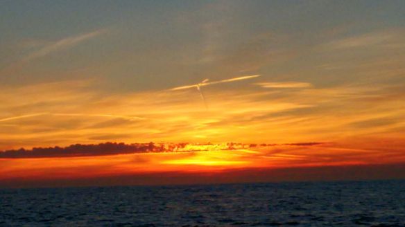 I thought I had passed the French shipping lanes with all the traffic behind me, until I looked up again to see more tankers in front. “Jeez”, I thought but at least France looked bigger. Rob joined me for an hour and told me that I should be able to match his pace. Needless to say the pace went up at once and “Tallyho” off we went. This got my pace up which I think was maintained for the remainder of the journey. It was getting dark with the sun setting behind, the lights on ships twinkling around and the lighthouse beam searching. I felt good and positive and thought how lucky I was to have given this opportunity. I always enjoyed night swimming and this night was beautiful with the glow sticks and lights reflecting on the sea and two spotlights from Louise Jane constantly on me.