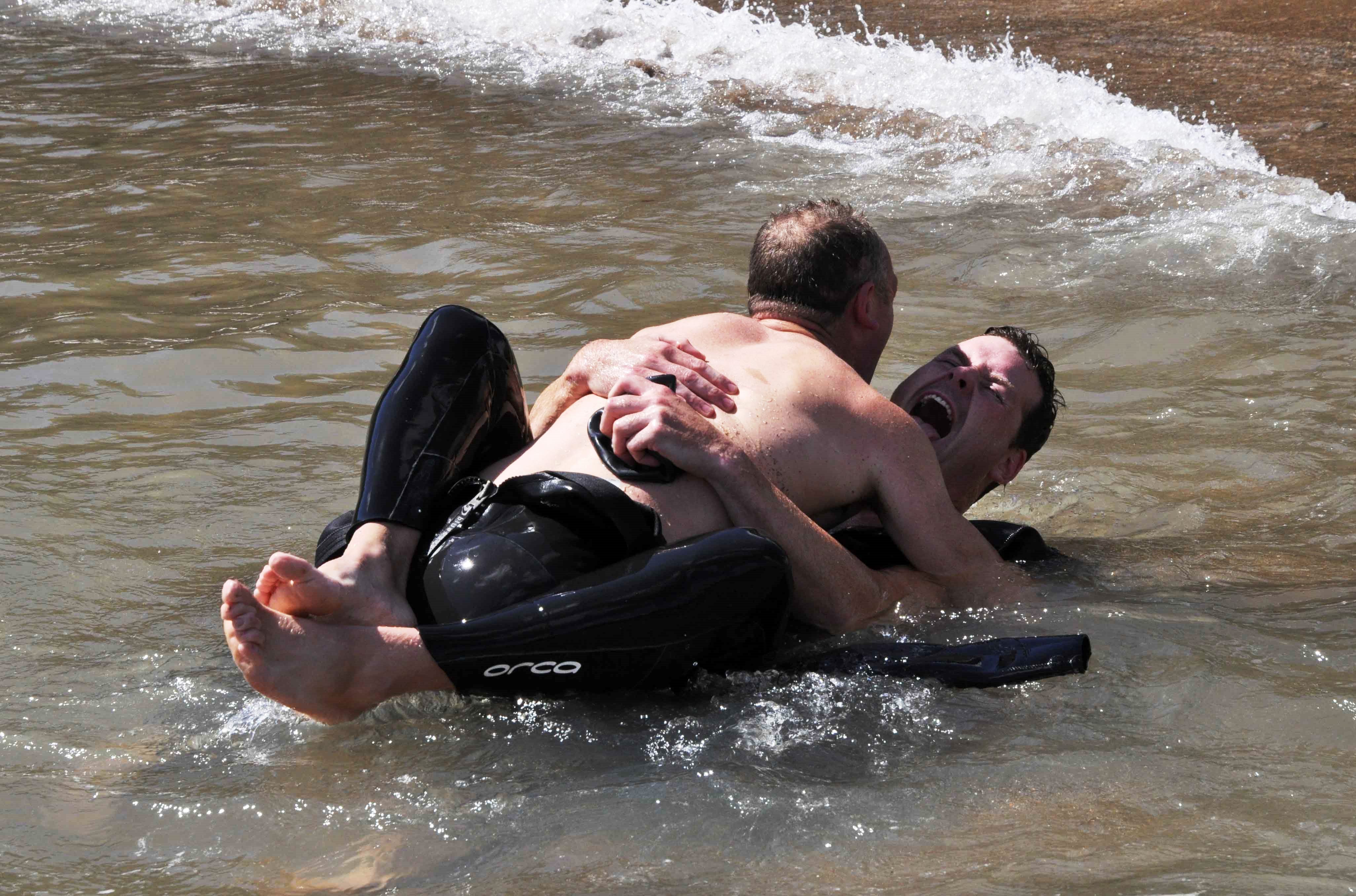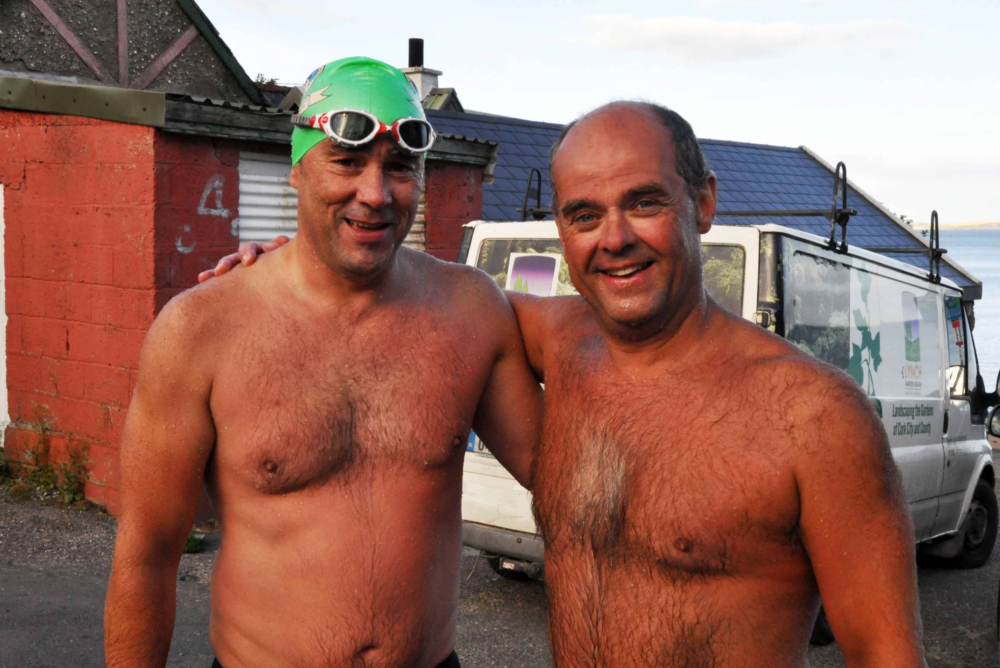 Speaking of serious swims, Trevor Malone broke the fastest time for an Irish swimmer from Africa to Europe in the last few weeks. As usual, Bernard was straight in for the photo with the returning hero. Here they are – to quote Carol Cashell – brown and browner.